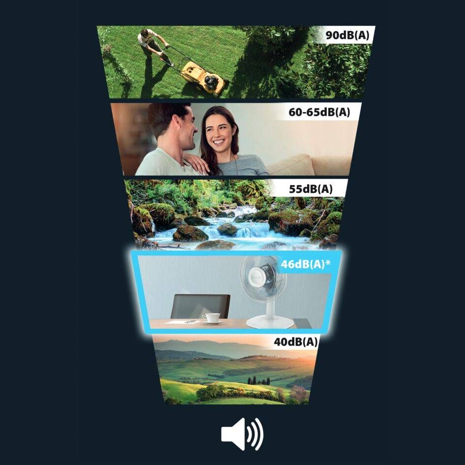 Scopri un ventilatore da tavolo che offre una freschezza potente. Imposta la velocità massima per un effetto di raffreddamento intenso anche negli ambienti più caldi. Oppure seleziona l’impostazione minima per una freschezza silenziosa e indisturbata, ideale per rilassarsi, guardare la TV o lavorare. Un effetto fresco in base alle tue esigenze! Le 3 velocità regolabili uniscono un’oscillazione ampia e un orientamento regolabile per assicurare la diffusione dell’aria necessaria. Inoltre, il design compatto lo rende facile da trasportare e riporre.