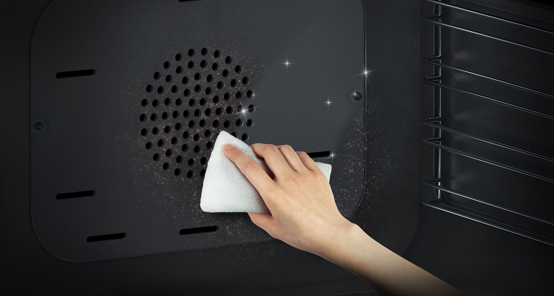 Un sistema di pulizia catalitica facilita il mantenimento del forno pulito. Il rivestimento catalitico sul retro del forno assorbe il grasso dagli schizzi e dalle gocce durante la cottura e ad alte temperature qualsiasi residuo si ossida.