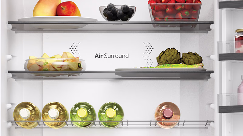 Con Haier Air Surround Fresher Tech, l'aria scorre in modo più delicato e soffice in tutto il frigorifero. Grazie alle speciali uscite laterali, da cui si diffonde l'aria, questo sistema distribuisce in modo omogeneo l'aria fredda che abbraccia il cibo in tutta la cavità del frigorifero, evitando così il flusso diretto sul cibo e senza causare perdita di peso e secchezza del cibo. Ecco perché Haier Air Surround mantiene il sapore, la consistenza e la succosità del cibo fino al 99%* dopo 7 giorni come il giorno 1.