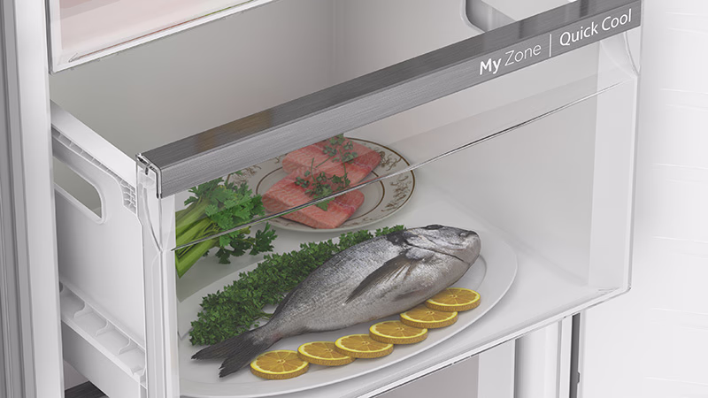 Il cassetto Quick Cool è estremamente versatile e può essere utilizzato in due modi diversi direttamente dal display esterno. Il cassetto Quick Cool, raggiunge la temperatura di 0°C più velocemente per raffreddare meglio i tuoi cibi. Può essere utilizzato anche come cassetto My Zone a 2°C per conservare carne e pesce.
