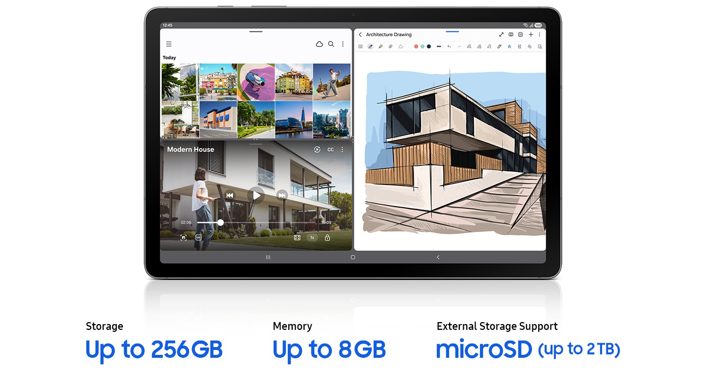 Con memoria fino a 8 GB, puoi riprodurre contenuti e dedicarti a più attività contemporaneamente senza interruzioni. Lo spazio di archiviazione fino a 256 GB, espandibile fino a 2 TB con scheda microSD, e la nuova S Pen ti aiuteranno a concretizzare ogni tua idea e a lavorare con efficienza, conservando tutto in un unico spazio.