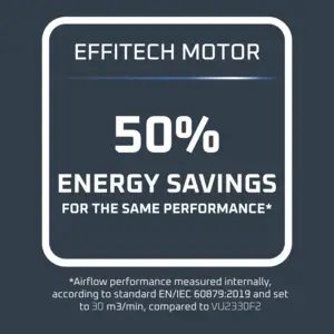 Goditi le stesse prestazioni consumando il 50% di energia in meno. Prestazioni del flusso d'aria misurate internamente, secondo lo standard EN/IEC 60879:2019 e calibrate su 30 msup>3/min, rispetto alla versione VU5640F2.