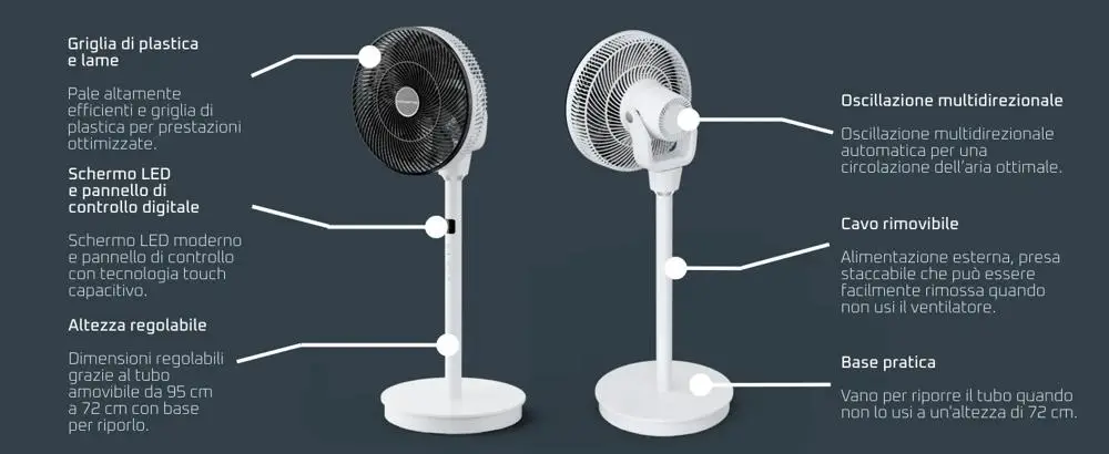 Un moderno design 3-in-1 con altezza regolabile (72 - 95 - 120 cm) per l’uso come ventilatore da tavolo o a piantana, dotato di un tubo extra.